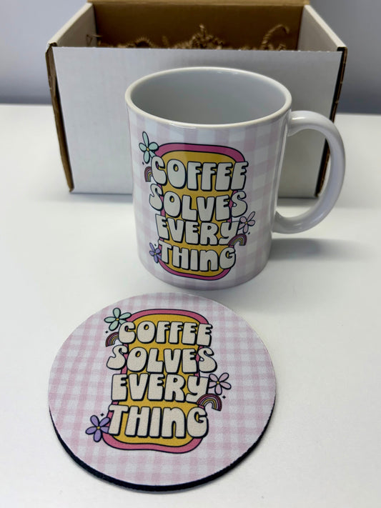 Coffee Solves Everything Mug & Coaster Gift Set – 11oz Ceramic Mug + Matching Coaster