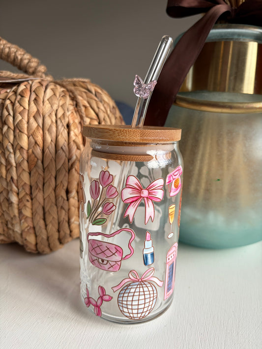 Cute Retro Glass Can Cup with Bamboo Lid & Curved Glass Straw 16oz
