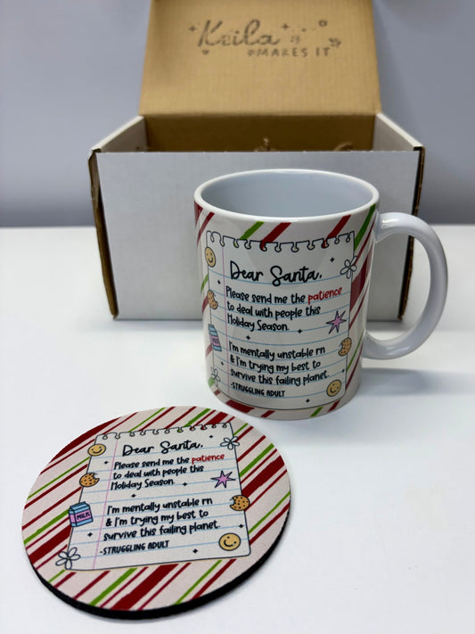 Funny Santa’s Letter Mug & Coaster Bundle – 11oz Ceramic Mug + Matching Coaster – Holiday Gift Humor