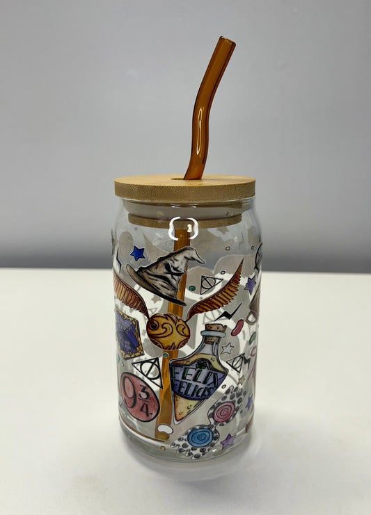 Harry Potter Themed Glass Can Cup | UV DTF Design | Bamboo Lid & Curved Brown Glass Straw – 16oz