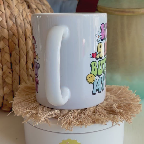 Our “Bit of a Mess But Doin’ My Best” Ceramic Mug is the perfect reminder that it’s okay not to have it all together. With its colorful retro lettering, cheerful smiley and daisy details, this mug makes every sip of coffee, tea, or cocoa a little brighter.