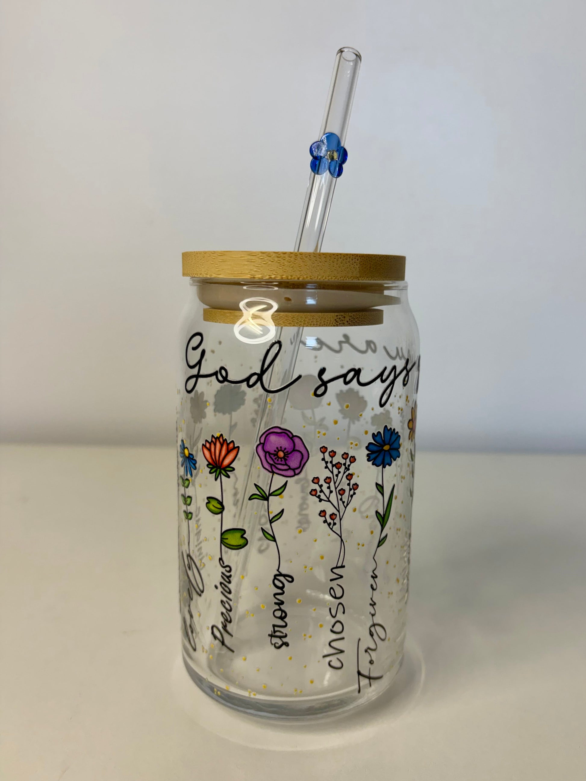 “God Says You Are” Glass Can Cup – UV DTF Christian Inspirational Cup, Flower Glass Straw & Bamboo Lid (16oz)