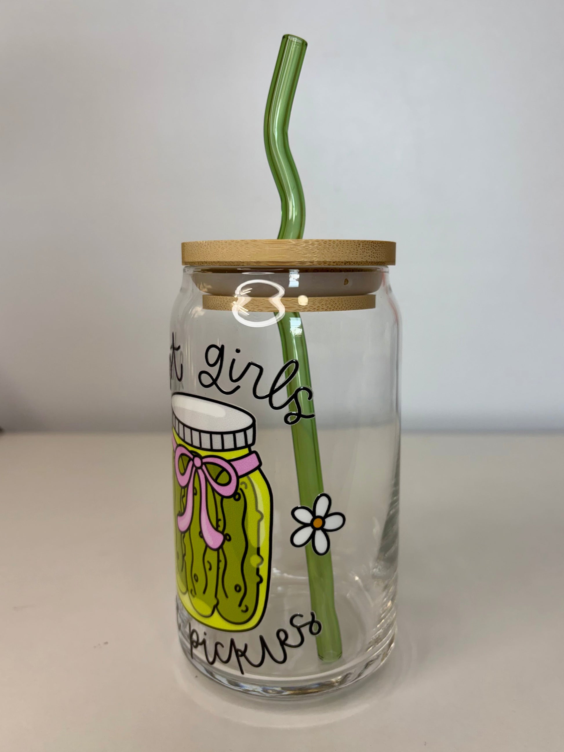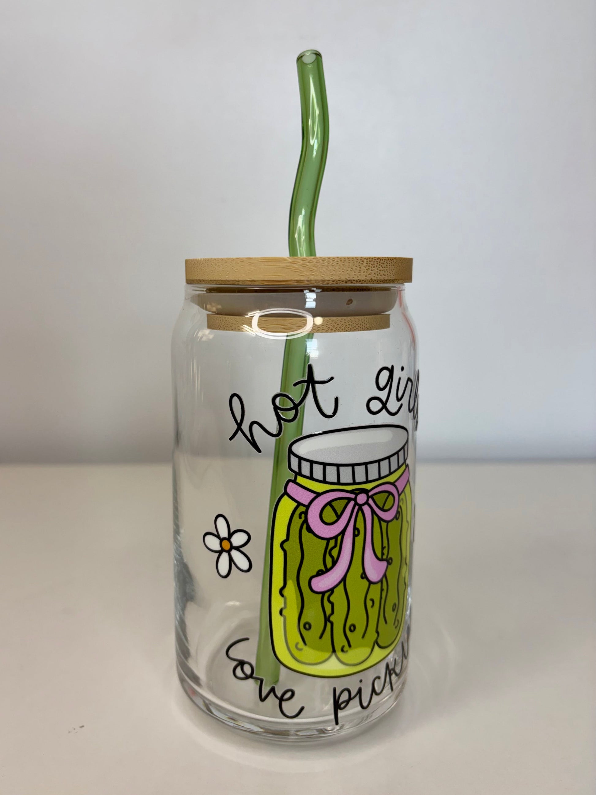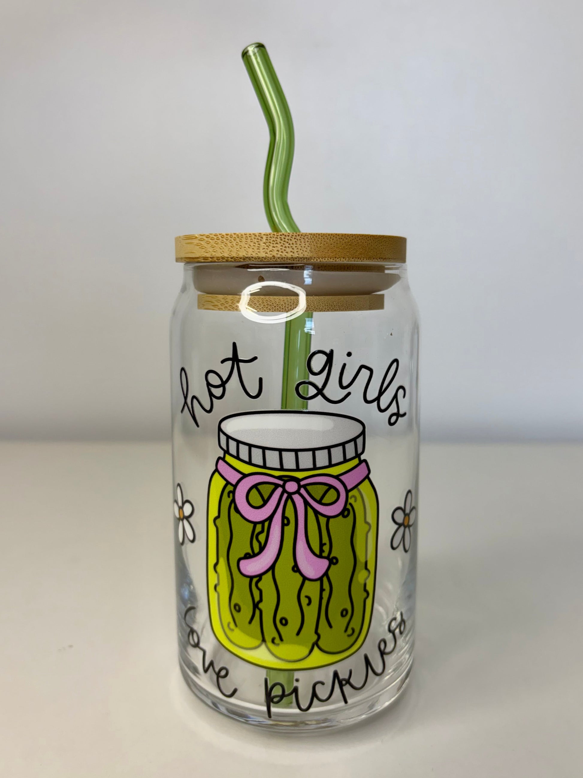 Hot Girls Love Pickles Glass Can Cup β 16oz UV DTF, Curved Green Straw & Bamboo Lid